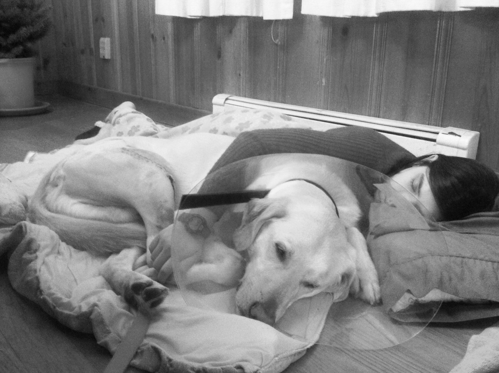 Well it did not. The limp started getting worse and I had no choice but to contact a surgeon. A check up confirmed ‘Yup, he has torn his cranial cruciate ligament in his right hind leg!’ The dreaded surgery was inevitable. The surgery itself is not that big of a deal however the recuperation is. The dog, after the surgery, is supposed to be in crate rest for at least two weeks with only bathroom breaks. Movement has to be severely restricted so as not to cause more injury to the afflicted leg and to let it heal. The idea of crating Sage made me very distressed because he had hated the crate as a puppy and so we, being the indulgent parents, never put him in it. Crate rest after surgery would be miserable for him AND for us. Sean and I took our nervous boy to see the surgeon, she evaluated him, set up a surgery date and then I broached the dreaded question. Does he need to be crated to recuperate? The doctor became my favorite person as she shook her head. She did not see the need to crate an animal who has never been crated. They are already traumatized and in pain, there is no reason to add to their trauma. “Just restrict his movements”, she said. The surgery was done. We knew Sage would be in bad shape but when Sean brought him home, I started crying. He was groggy, his leg was all stitched up and as he walked blood dripped on the floor. He had the hated (by him) cone of shame so he did not bite his stitches.